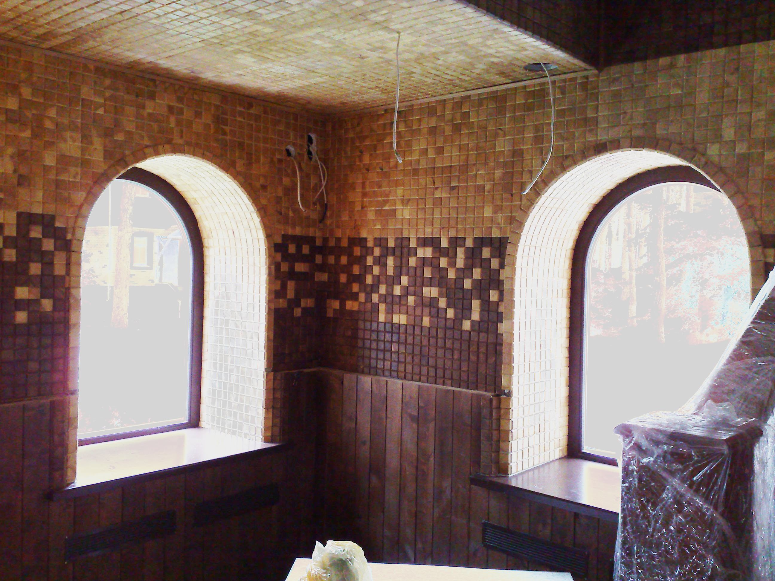 Дерев’яна мозаїчна плитка представляє собою декоративне покриття товщиною 6 та 15мм, розмір 301*301мм, основа - скловолокно.Застосування: - стіни, підлога, стеля, арки, колони, відкоси, барні стійки тощо.Характеристика: - плитка має поперечний зріз, який у 20-30 разів міцніший від поперечного, відповідно - стійкіший до механічних пошкоджень (не боїться каблуків, ніжок меблів тощо).Особливості укладки: - при укладці на підлогу рекомендується каучуковий клей, на стіну - звичайні герметики, силікони точково.Основу потрібно прогрунтувати, можливо тонувати під колір дерева.Рекомендовано використовувати хрестики для плитки для рівної укладки плитки.Фінішне покриття дерев’яної плитки - масло, лаки, бейци..