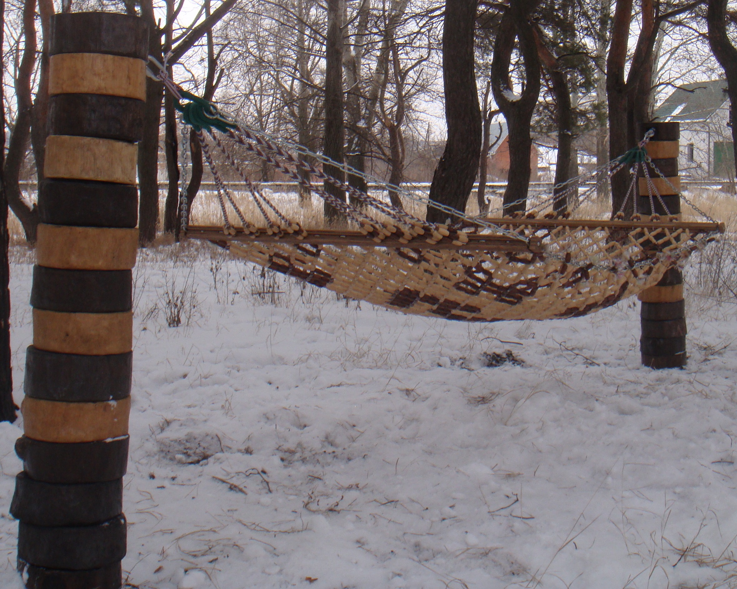Сочетание цепи, кованого крепления и исключительно твёрдых пород дерева(дуб, бук, ясень). Предают изделию прочности и долговечности(устойчив к осадкам). А инкрустация деревом простой мысли(как гамак) позволяет перевезти его в разряд(мебель для сада). Который послужит великолепным дополнением к вашим приусадебным владением, и позволит в полной мере в жаркий, летний день насладится прохладой любимого сада.P.S. Гамак состоит из более 2400 шт, отдельных деталей, Работа трудоемкая, просьба заказы делать заблаговременно. Украина+Россия.
